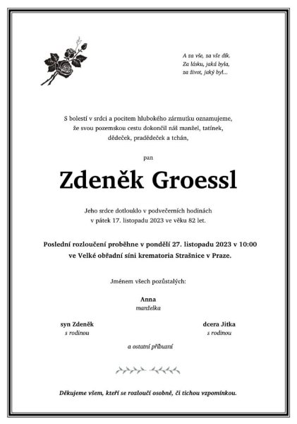 Poslední rozloučení proběhne v pondělí 27. listopadu 2023 v 10:00 ve Velké obřadní síni krematoria Strašnice v Praze.