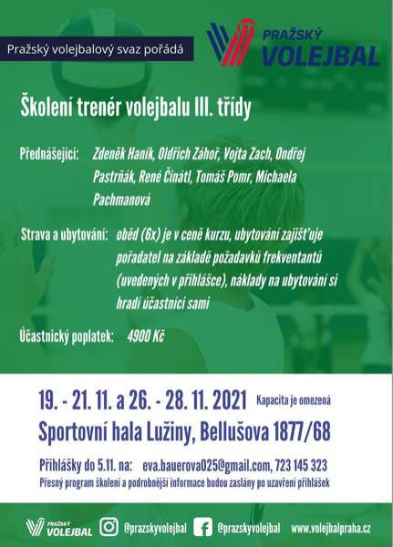Pražský volejbalový svaz pořádá školení trenérů volejbalu III. třídy, které se bude konat v termínech:
